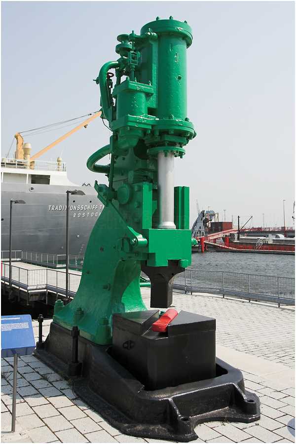 Der 4,30 m hohe Hammer mit einer Fallmasse von 800 kg war bis 1984 auf der Neptunwerft Rostock im Einsatz. Mit ihm konnten u. a. Schäkel und Kauschen für die Ausrüstung von Seeschiffen geschmiedet werden.